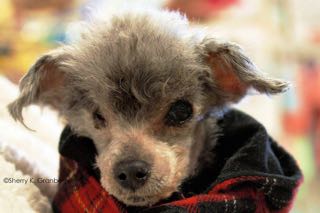 Meet Sophie--our newest SOS dog. She came to CPR in 2011. She's a poodle mix who is somewhere around 13 years old. Found as a stray in Manassas Virginia, Sophie has no eyes. She was found that way. Apparently they were surgically removed. She can be a bit grouchy but can you blame her? She really doesn't like to be picked up or bothered, and doesn't think much of other dogs either. Sophie has been in a foster home since she came to CPR, and foster mom has been trying to take care of all her needs. Her foster mom says that she is the only one who can pick her up and love on Sophie. She hates being groomed and hates even more having her face touched, but they manage.