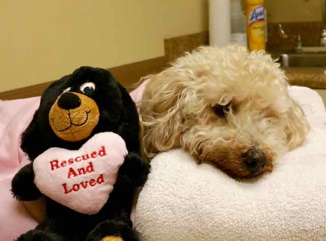 Did you know there is a summer romance series going on as we speak? It involves two of our SOS dogs and a-soon-to-be SOS dog. As reported by sources that know, it seems Jacques, a 17 year old toy poodle soon-to-be SOS dog, has fallen in love with Marlene, our 10 year old almost-blind SOS toy poodle. They have been seen sunning themselves side by side and have been caught napping in the same bed! It's the talk of the Ezzell household! Will this May-December romance survive or is heartbreak on the horizon?